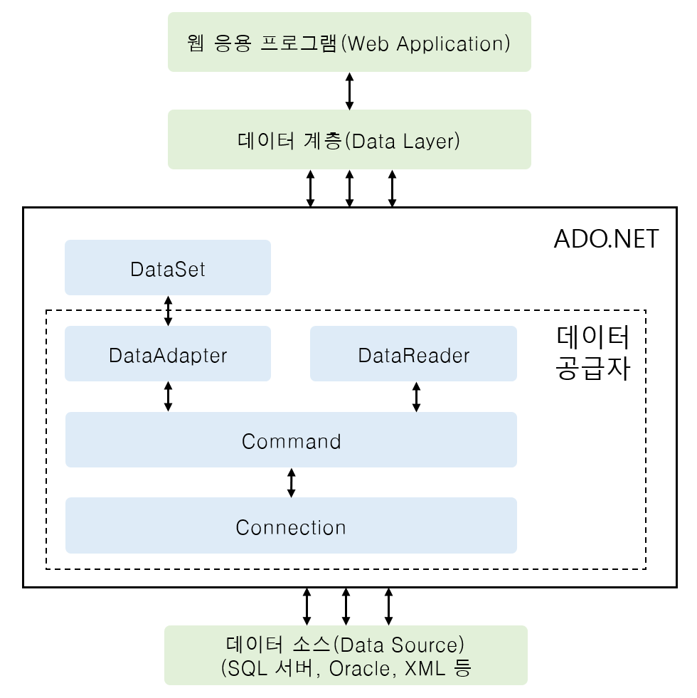 ASP.NET의 데이터 접근 구조는 크게 웹 응용 프로그램, 데이터 계층, 데이터 공급자, 데이터 소스로 나누어진다.